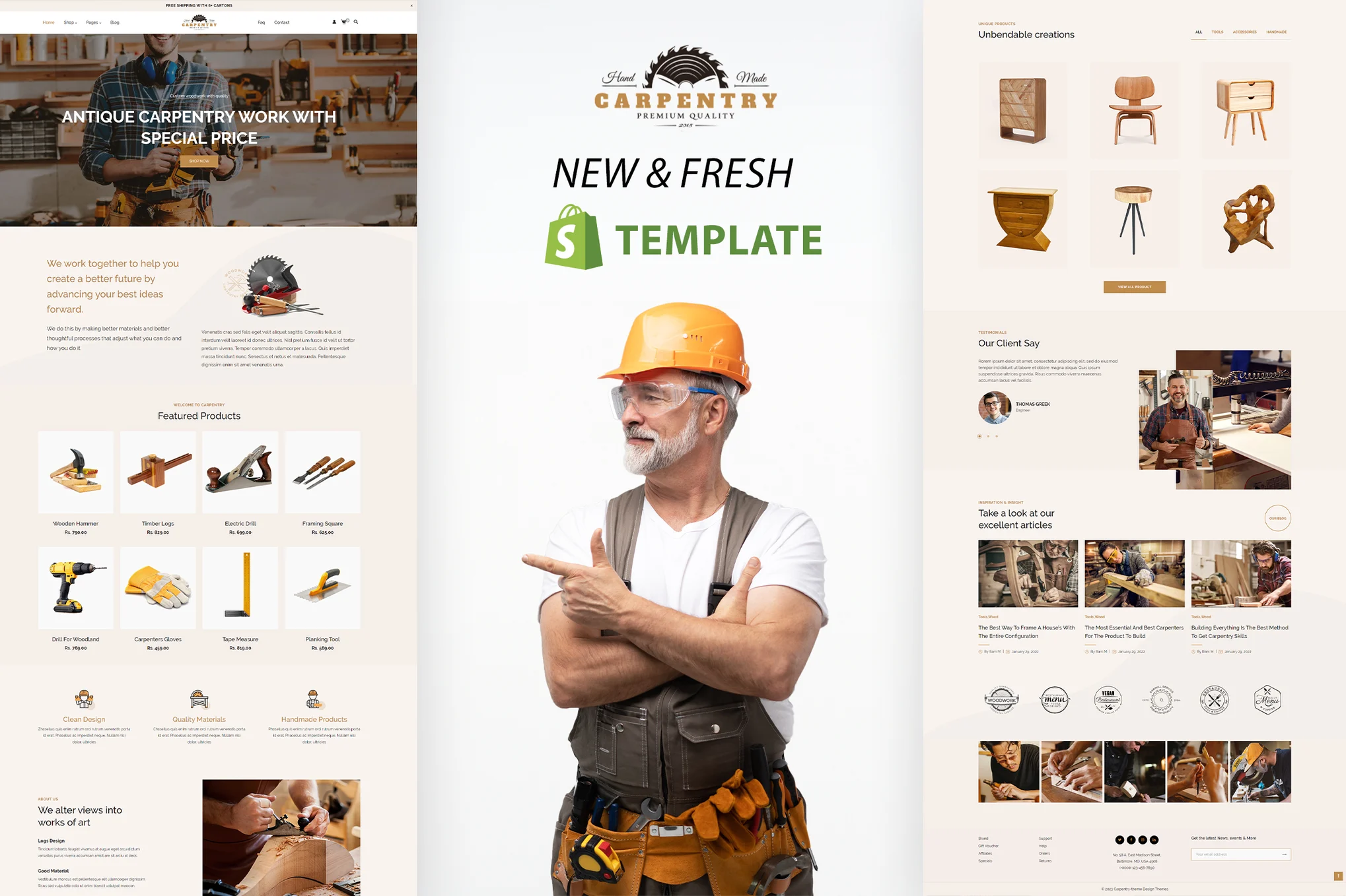Carpentry shopify Theme covers various services, such as furniture design and construction, door and window installation or repair, flooring installation, trim and molding installation, custom woodworking, stair construction, structural framing, wood structure and furniture repair, and restoration.The carpenters execute the following tasks as well – installing kitchen cabinets, fixing or constructing showcases, installing fixtures such as molding and windows; following blueprints, helping in the erection of building framework, inspecting and fixing repaired woodworks and directing workers and other construction laborers.